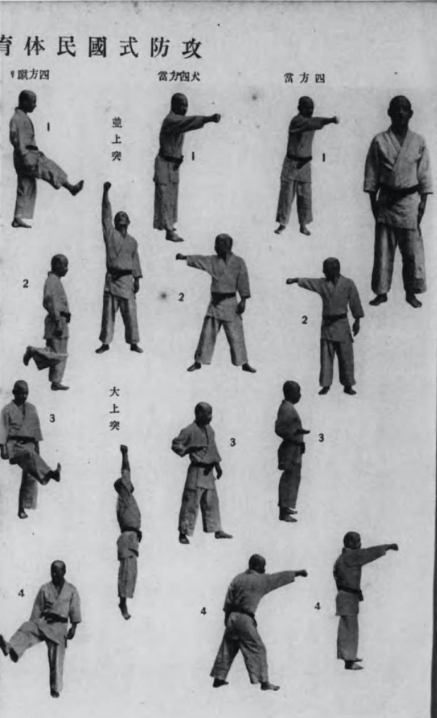 Jūdō historian Lance Gatling (www.kanochronicles.com) explained in a Facebook post last year that this type of practice is referred to as Kōbōshiki Kokumin Taiiku (攻防式国民体育)—an “attack and defense” form of national physical education. According to Gatling, these exercises were developed by Kanō and his associates as early as 1924, prior to his 1927 trip to Okinawa. However, one need not be an expert to notice that the techniques depicted in the 1927 issue of Sakkō resemble the forms of karate that Funakoshi Gichin had been teaching in mainland Japan since 1922.