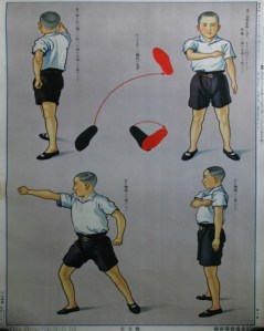 A publication titled Jūdō shidō kakezu (Jūdō instruction wall chart) from the Tōkyō Higher Normal School (dated circa 1939) by Kanō’s disciple Sakuraba Takeshi (櫻庭武, 1892–1941) vividly illustrates the physical exercises required of schoolchildren, using child-friendly drawings. These exercises, conducted twice a week for 30 minutes outside of regular class hours, were part of a broader program aligned with the increasing militarization of Japanese society in the late 1930s.