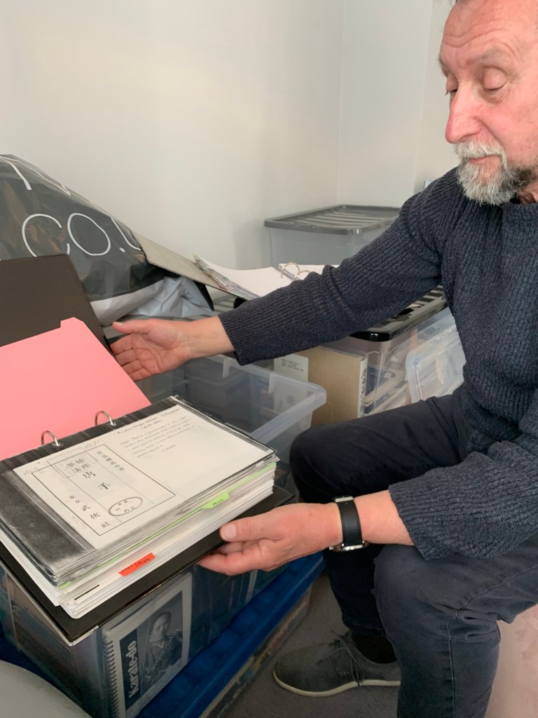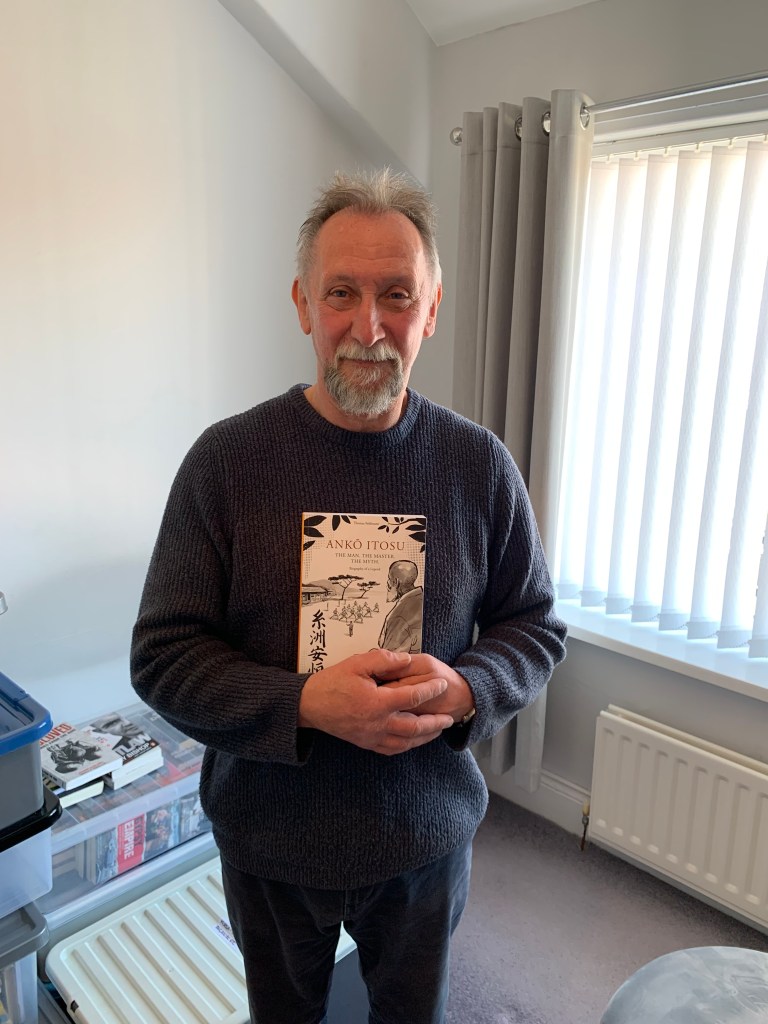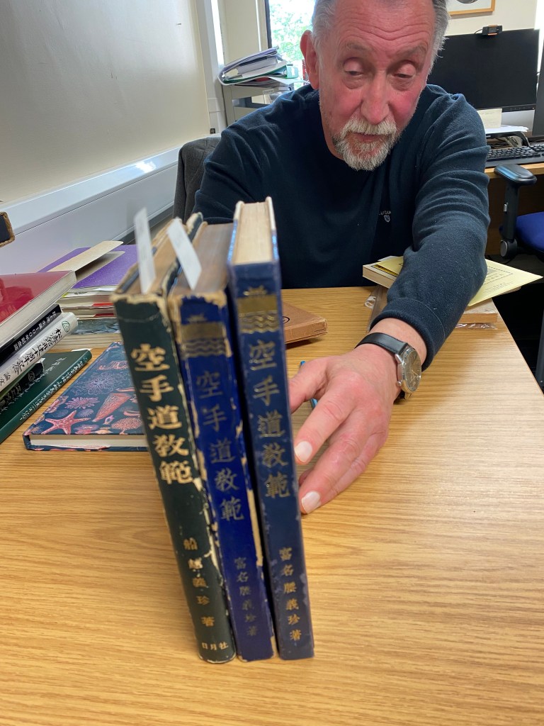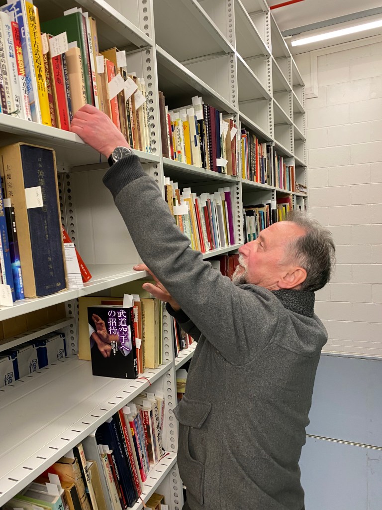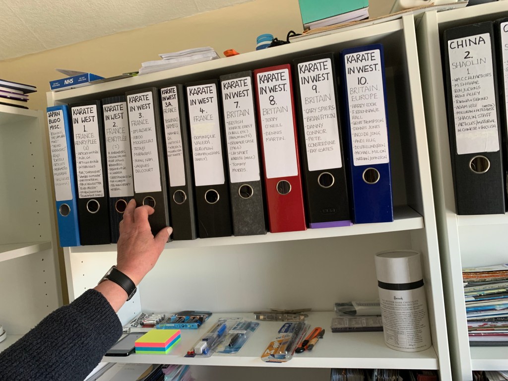 I first came into contact with Graham during my research for my book about Itosu Ankō (1831–1915)—published in 2021—thanks to an introduction by Mark Tankosich (Hiroshima). Of course, I had already long been familiar with Graham’s name—and with his work. For decades, he has dedicated himself to the history of martial arts, with a particular focus on karate, though his scope also extends into other disciplines. His portraits, historical overviews, and interviews with leading experts were groundbreaking in their time. Even today, excerpts of his writings continue to appear—for instance, in Shotokan Karate Magazine—and he is frequently cited by scholars and practitioners alike. For me personally, Graham’s invaluable research on Itosu Ankō and Yabu Kentsū (which I researched after I had finished my previous book on Itosu) was decisive. Above all, it was the difficult-to-access sources—materials from Japanese sources and from libraries across the world—that Graham painstakingly gathered which proved especially valuable. Over many decades, he corresponded with like-minded researchers, martial artists, and masters—including Ôshima Tsutomu (born 1930), Ohgami Shingo (1941–2019) and even Gima Makoto (1896–1989)—on a wide variety of topics, building a body of material that is truly one of a kind. When I visited Graham in northern England in April 2022, I did not at first grasp the full extent of his collection. His house was filled with boxes of books, folders, and assorted documents, with shelves packed to the brim. The collector in me would gladly have taken on such a treasure trove—at a fair price, of course.