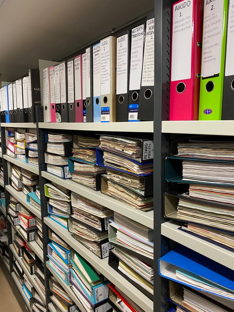Similarly researchers can access the Richard Bowen Collection, an archival collection of materials and publications on the history of jūdō, assembled by Richard Bowen (1926–2005), noted jūdōka and sports historian, which, after his death, was made available at the University of Bath in England. For research in this field, Graham’s collection is now essential. I cannot thank him enough for making his life’s work publicly available, and I can only strongly recommend it: the collection is simply outstanding. The university has begun the formidable task of cataloguing the material—no small undertaking given its sheer size and diversity. I had the opportunity to visit the library myself and to examine key sources for my own research in April 2025. I spent two full days there—far too short, I must admit. Graham was present for one day as well, and personally guided me through some of the most significant items in the collection.