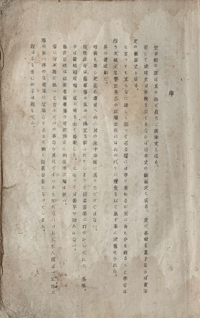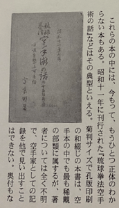 A Google search yielded little information about the manuscript, but according to the catalog of the National Diet Library, it was referenced in two publications: 武道学研究 Budōgaku Kenkyū (Journal of Budō Studies) (1979: 27) and 日本古書通信 Nihon Kosho Tsūshin (Japanese Antiquarian Books Newsletter) (1981: 30). In both cases, the author’s name is listed as Kōra (or Takara) Akihiro 高良昭広. The book also appears in Kawamoto Masayuki’s Karate Publication Catalog (1984: 2), under the title 琉球拳法空手術の研究 Ryūkyū kenpō karatejutsu no kenkyū (Research into the art of Ryūkyū kenpō karate).
