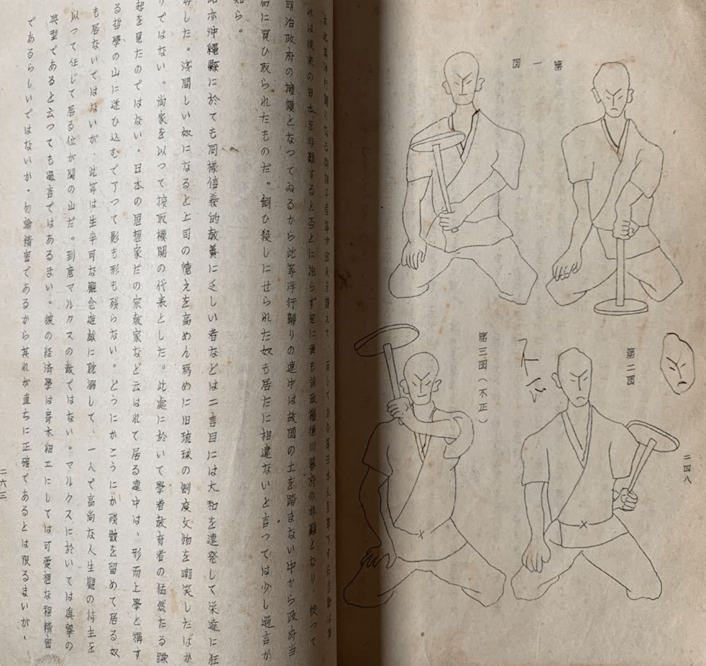 In my files I happened to come across a reference to this book that provides a little more information about its background. Takeishi (1999: 11–12) noted that the true identity of the manuscript remains unknown to this day. Produced in kiku 菊判 format (A4), stencil-printed, and bound in the traditional Japanese style, it is considered one of the rarest karate publications. Nothing is known about the author, and there are no indications elsewhere that he was ever active as a karate practitioner. Even an imprint is missing. Citing the text itself, Takeishi deduces the author’s background: “On 19 June 1936, at 3:45 p.m., I sit quietly in a room of a residence at 74 Horikawa-chō, Hakodate City, Hokkaidō, and lay down my brush.” Judging from the content, Takeishi concludes that although the author appears to have studied karate, he also seems to have engaged in a profession resembling that of a fortune-teller or divination specialist. Takeshi continues: “The first part deals exclusively with karate, but in the second part the book turns to the history of Ryūkyū, then discusses the utility of sexuality, and ultimately even arrives at a doctrine of the superiority of people of color over white people—the author allows himself to make virtually any claim he wishes. In this sense, it is a strange, indeed rather curious book.”